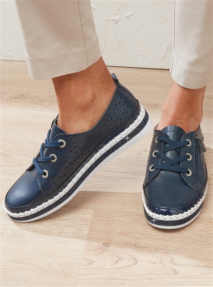 Add sparkle to your day with these stylish trainers featuring a lace-up and side zip design. Crafted from soft leather uppers with lasercut perforations and glittery eyelets, they’re set on a low platform heel lined with diamantes. Perfect for comfort and style, they suit city outings or special events.