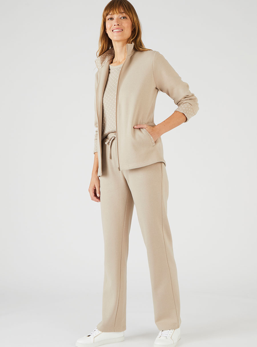You will love this amazing 3 piece tracksuit! Featuring a jacket with zip front and front pockets with contrast polka dot trim inside the collar. Full length pants with tie front and elastic waist for a comfortable fit and 2 side pockets. Crew neck printed tee featuring a lovely polka dot design. 65% Polyester, 35% Cotton.