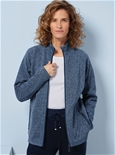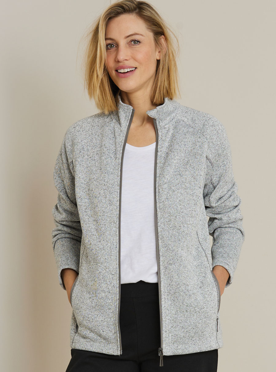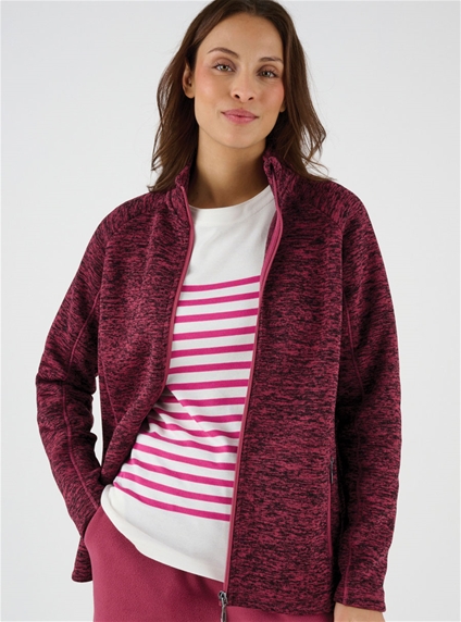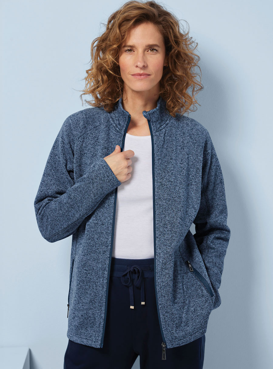 Sporty lounge jacket with brushed Thermolactyl fleece, stand-up collar and top-stitched cutouts for structure and style. Polyester.