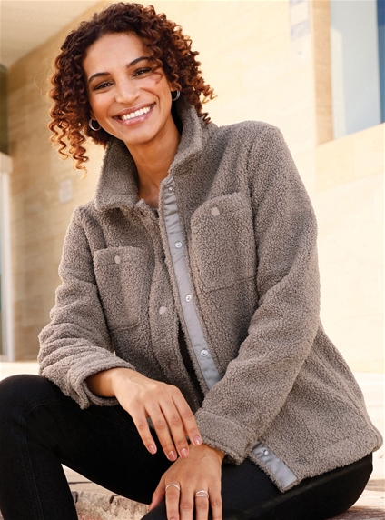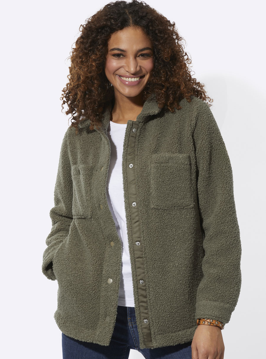Fluffy, soft teddy fleece jacket for the season! With turn-down collar and press stud placket. 2 breast pockets with press studs and 2 in seam pockets. Long sleeves with cuffs and press stud. Rounded hem at the front and back.