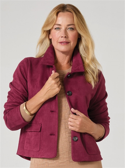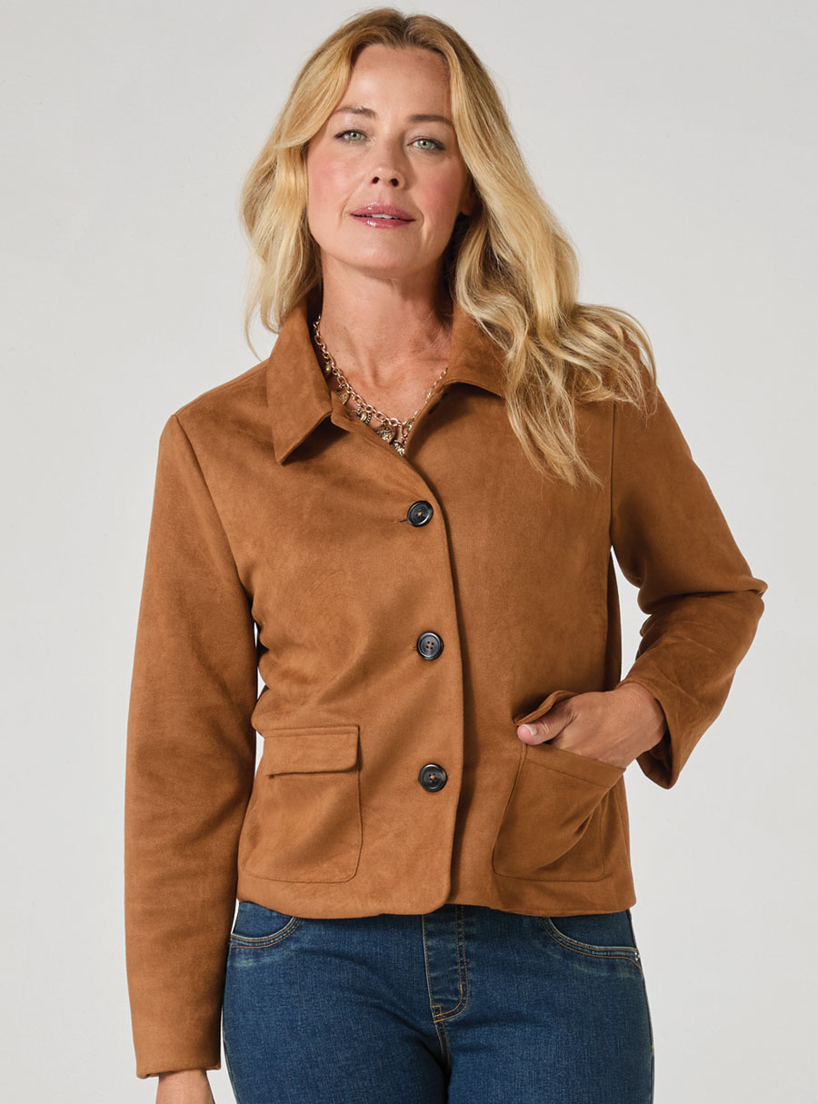 Fully lined suedette jacket with soft texture, button front and patch pockets, offering a lightweight, timeless layer for everyday styling. 95% Polyester, 5% Elastane.