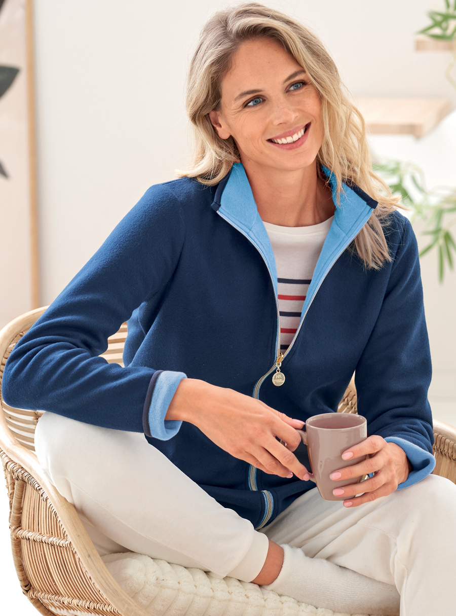 Thanks to its double layer of fleece, this jacket offers great comfort. Warm and super soft, it’s ideal for lounging around the house or doing a little activity... Fashion tip, roll up the sleeves to reveal the contrasting colour. 100% Polyester.