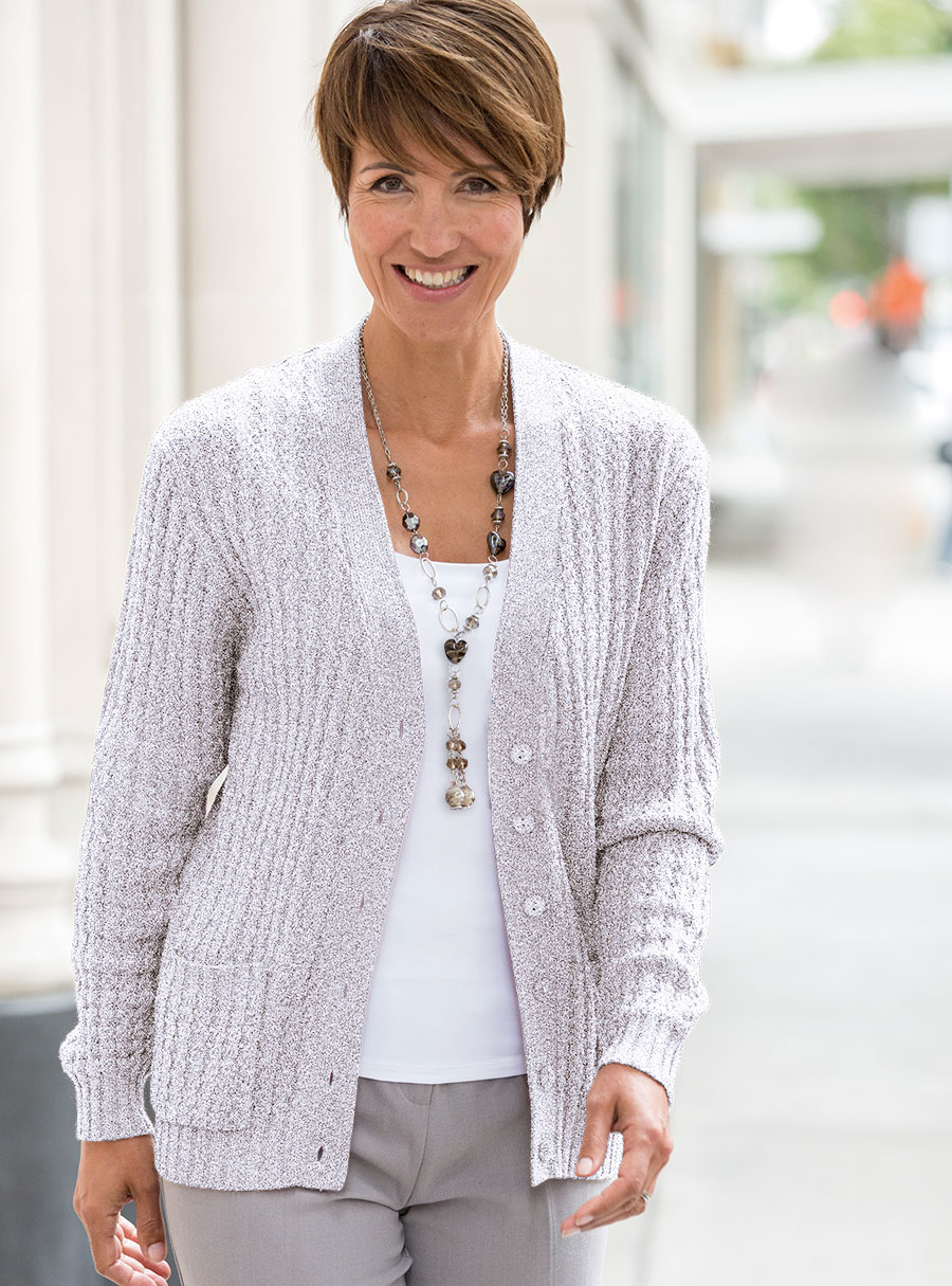Long sleeve button front cardigan with patch pockets and chunky knitted design. 100% Acrylic.