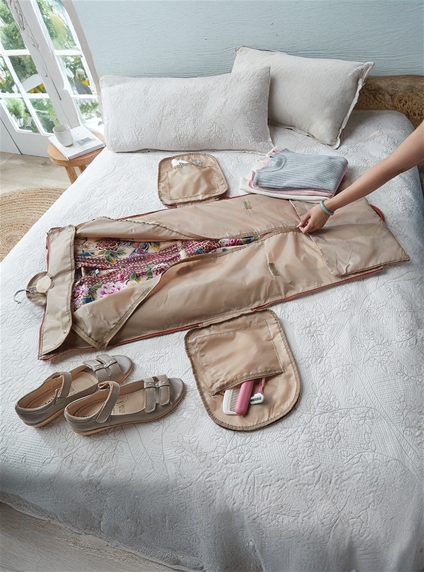 This ingenious bag opens up like a full-length garment carrier to keep your coats, suits and dresses flat while you travel and dust-free when you hang them up at your destination. It also zips into shape as a regular 52L x 31.75W x 22.5D cm duffle, with plenty of room for your other travel essentials. Made from tough, easyclean PU, it’s available in a choice of cream or black, both with a rich tan trim.