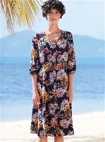 A light dress with tiered full skirt. Relaxed fit to suit all body shapes. 100% Crinkle Cotton