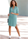 Pure, soft viscose modern shirt dress with collar, small V and 3/4-length sleeves that can be rolled up thanks to the button tab. The sophisticated pleat at the back makes it wonderfully playful and loose. With side slits at the rounded hem. 100% Viscose.