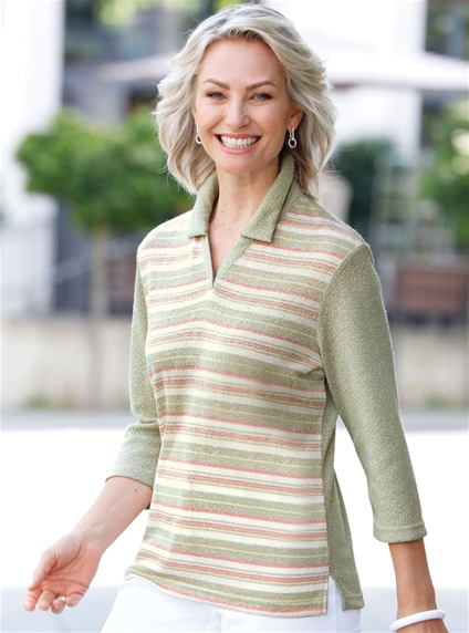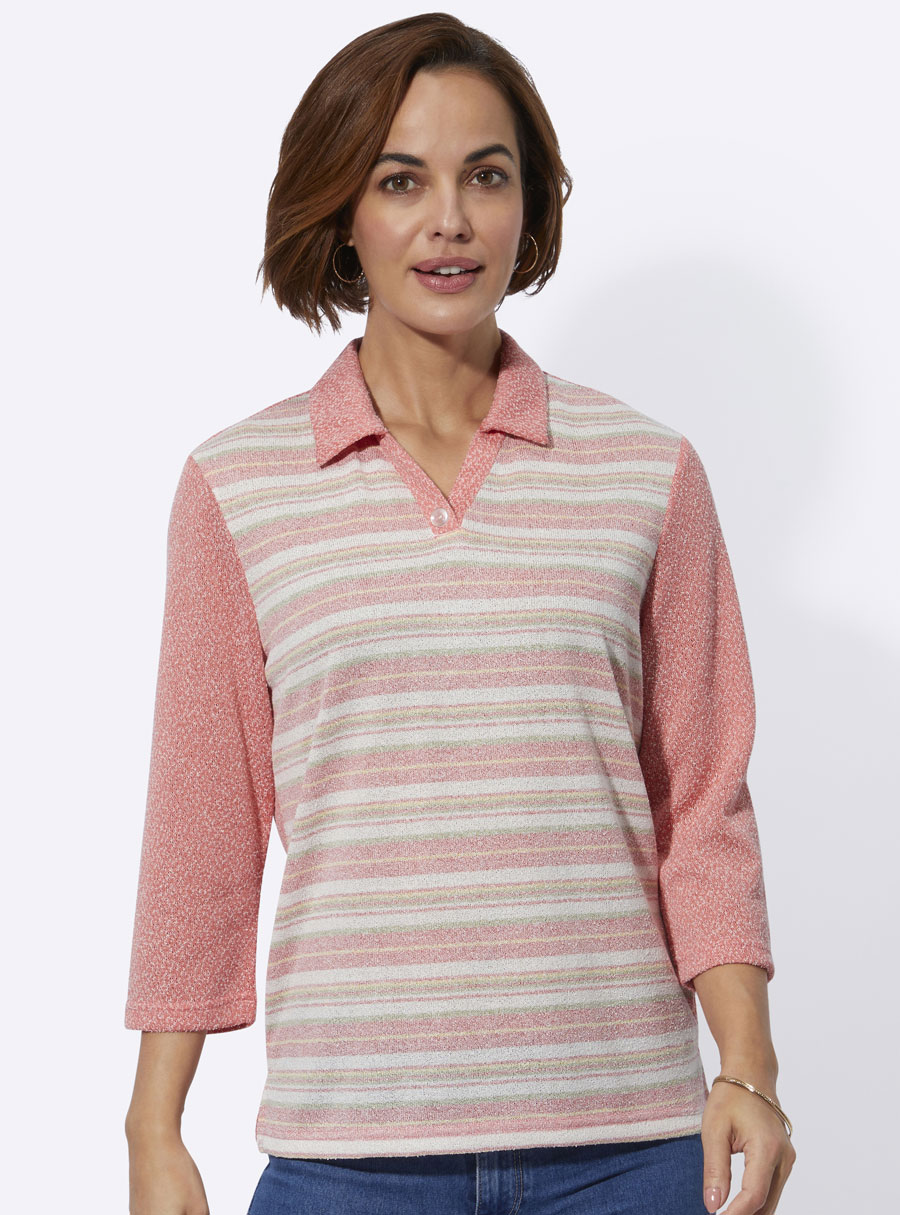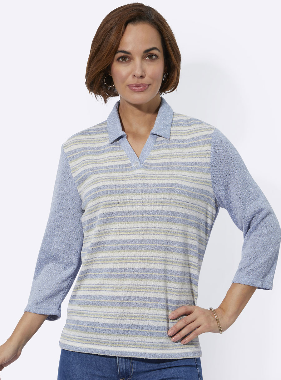 In lightweight bouclé fabric: polo shirt in a harmonious, high-quality yarn-dyed striped design. With an open V and decorative button. 3/4-length sleeves. Side slits.