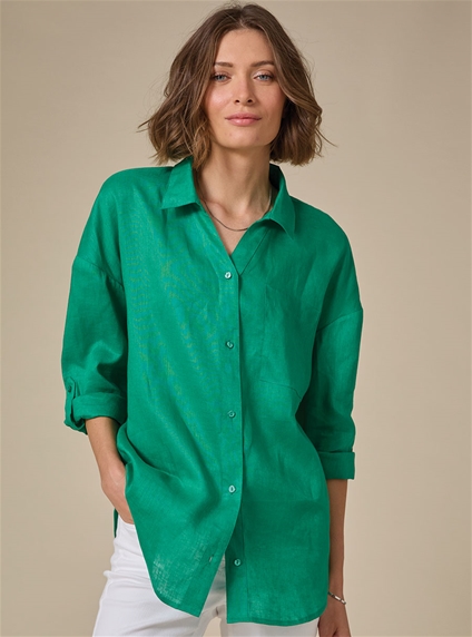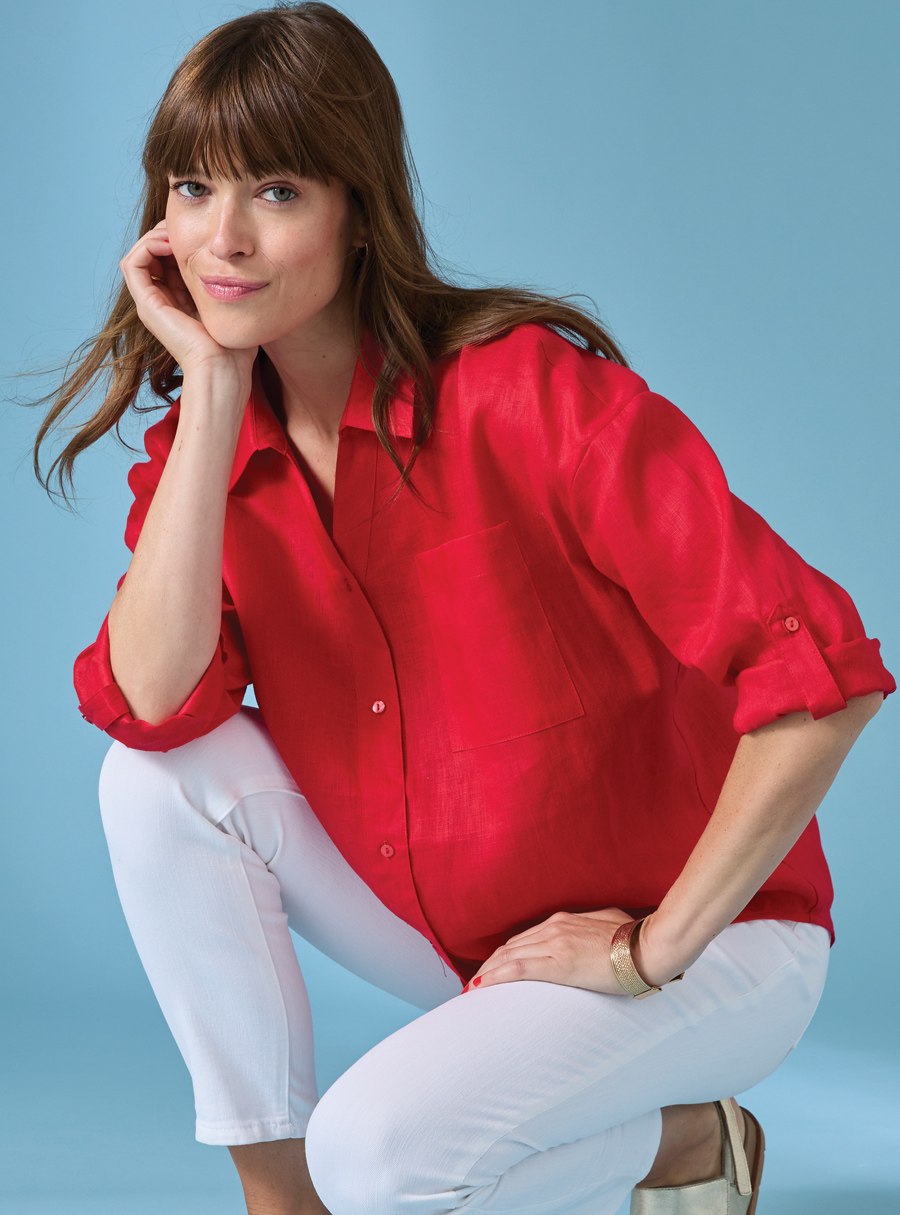 A shirt that is just as comfortable as any tee! This shirt will keep you cool thanks to the linen and cotton blend. A button front with a chest pocket on the left side. Wear the sleeves long or at 3/4 length thanks to the tab back and button. 60% Cotton, 40% Linen.