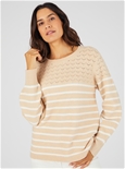 Soft touch yarn sweater with a feminine pointelle detail. Stripes give it a casual feeling. 69% Polyester, 20% Acrylic, 8% Wool, 3% Elastane.