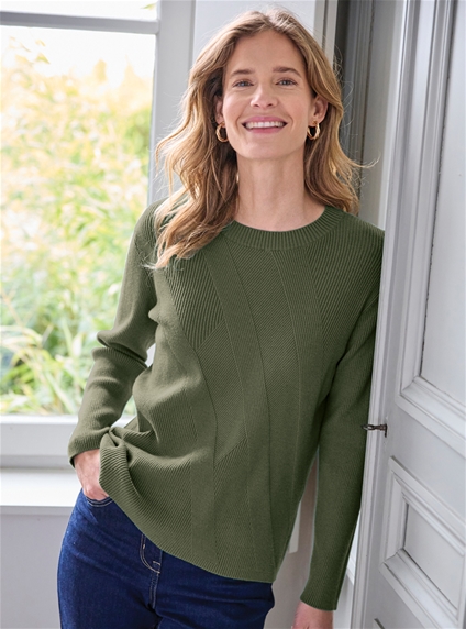 A timeless knit with a set of elongating diagonal rib stripes. An ideal sweater to wear under a jacket with jeans, pants or skirt. Round neck. Length approximately 62cm. 50% Viscose, 30% Polyester, 20% Polyamide.