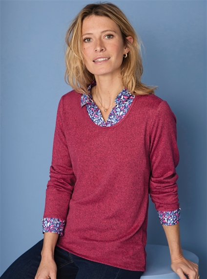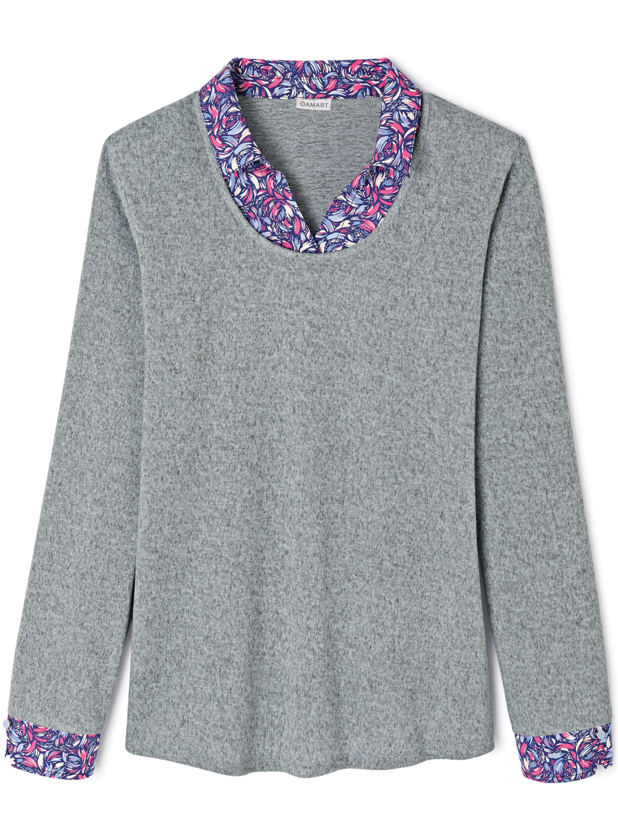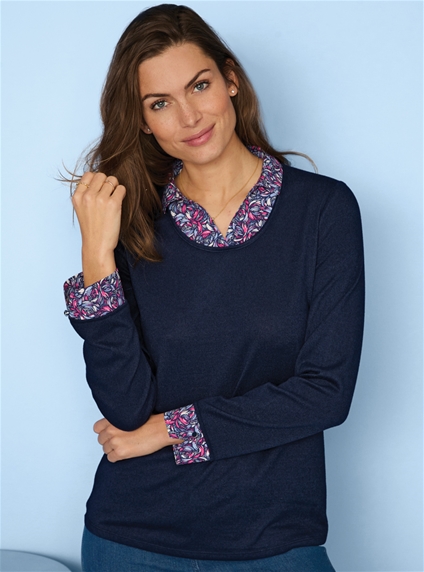 Easy to wear 2 in 1 polo sweater, with woven printed collar and cuffs. Wear it with denim or dress it up with your favourite tailored pant. 95% Polyester, 5% Elastane.