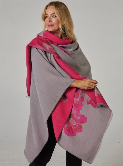 Reversible poncho style shawl with bold floral detailing in contrast colours, offering a versatile and elegant layer.