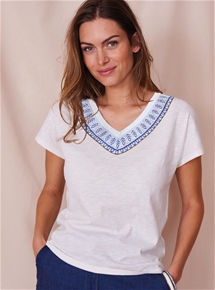 Step out in style with this openwork and scalloped embroidered tee. In a pretty palette of colours, this top is easy to coordinate with all of your favourite looks! A round neckline and short sleeves with a pure cotton makeup for extra comfort. 100% Cotton.