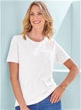 Casual feminine cotton tee, in bright tones or white with a broderie pocket detail, making your back to denim outfit a touch prettier. 100% Cotton.