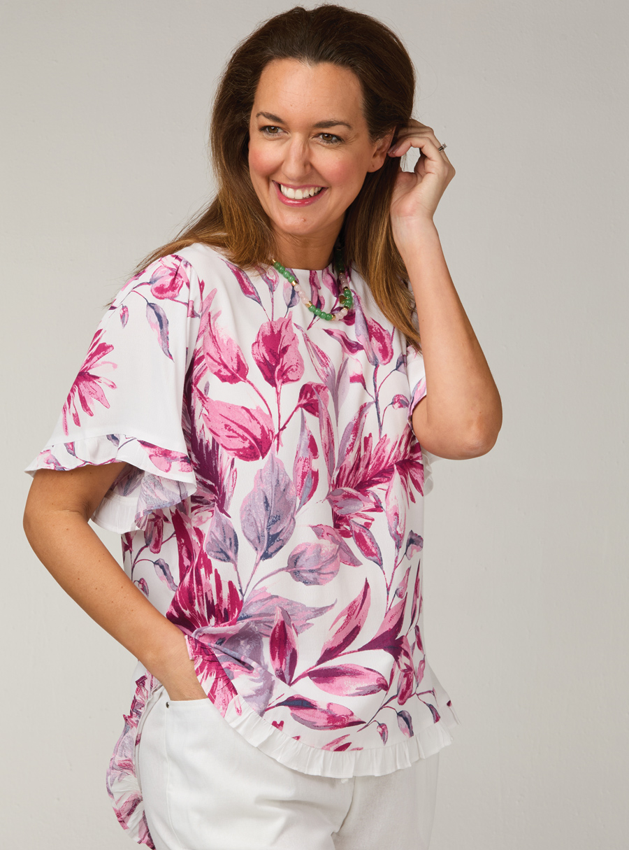 Soft, light and effortlessly feminine, this top brings a touch of charm to everyday dressing. Designed in a smooth viscose fabric that drapes beautifully. Featuring fluttery short sleeves, ruffle hem detail and a relaxed fit for all-day comfort. 100% Viscose.